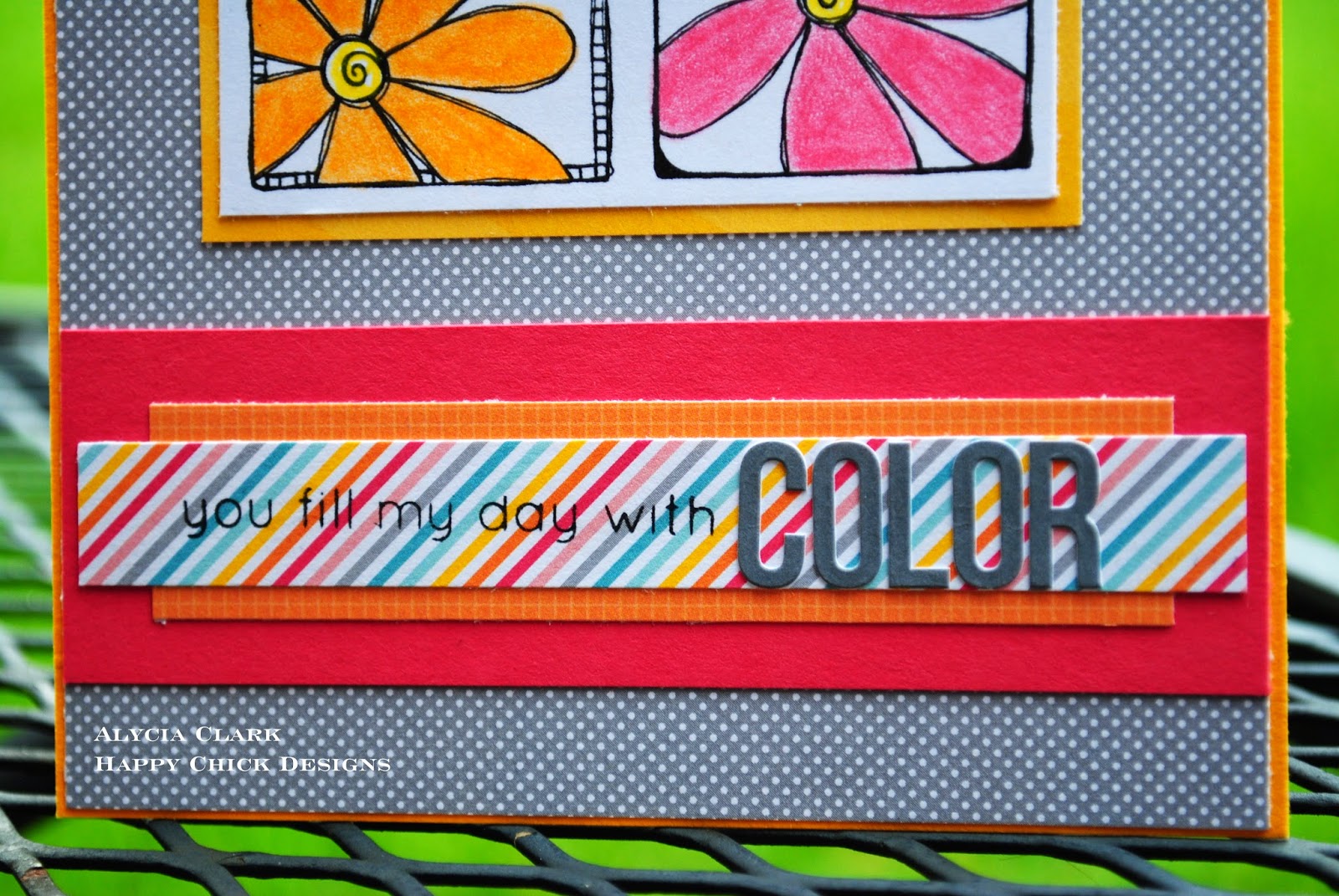 I got to use the scraps from my Simon Says Stamp Card Kit (no longer available). I colored my image, Daisy Squares, with Prismacolor pencils.